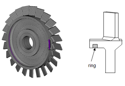 Bladed disk system with a ring damper (left), Cross section of the Blisks system (right)