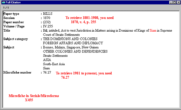 Indexes the British House of Commons bills, reports, accounts, and command papers, 1801 to within two years of current. Approaches include keyword, committee, author, and date. Provides sufficient information to locate the microfiche copies in the Graduate Library's Serials/Microforms Room: MICRO-F X455. It does NOT index Parliamentary Debates.