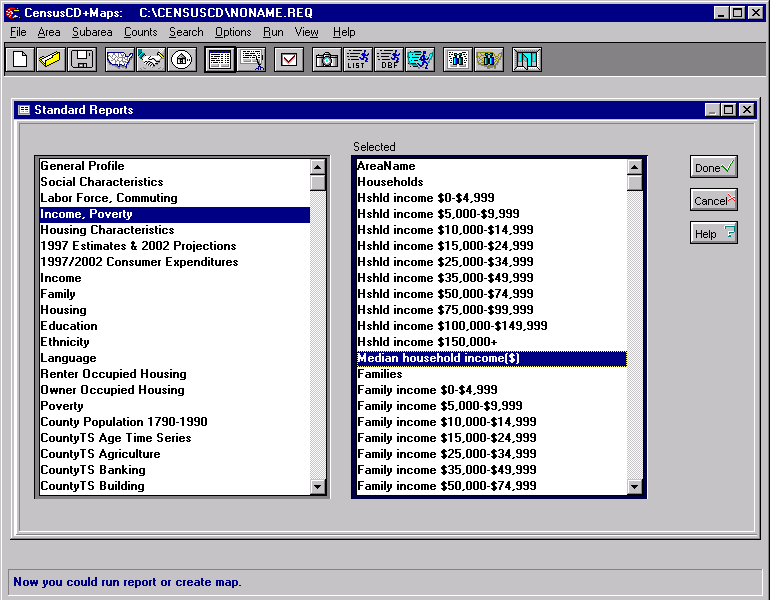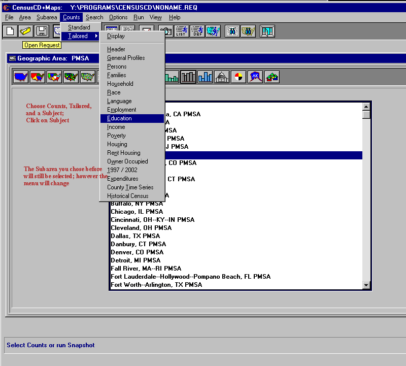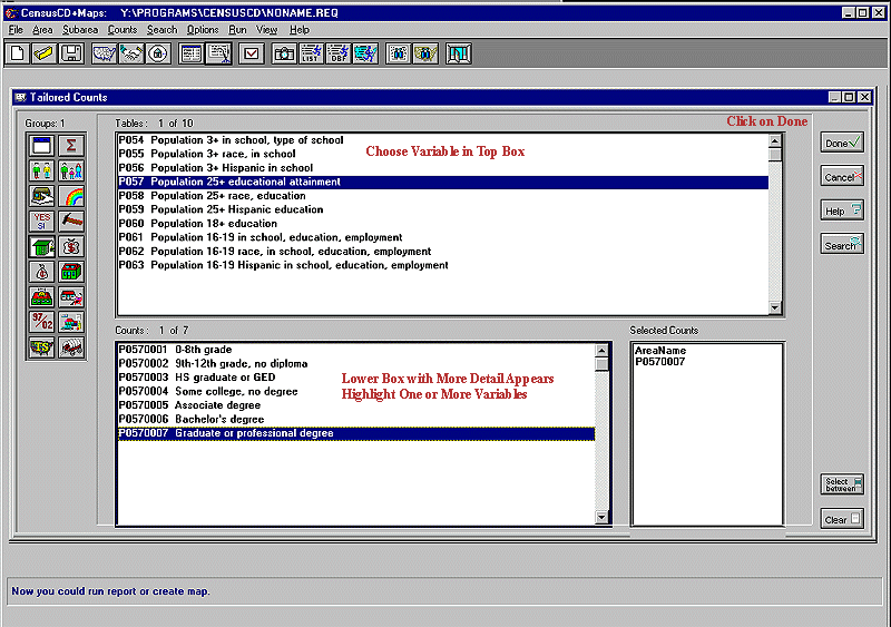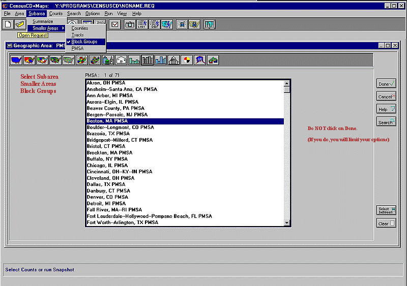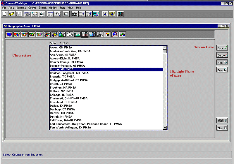 3. Click on Area/Geographic Area/PMSA. Click on Boston PMSA. Press DONE if you only want the Boston PMSA. Do NOT press done if you want to run the Boston results on other PMSAs at a later time.