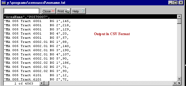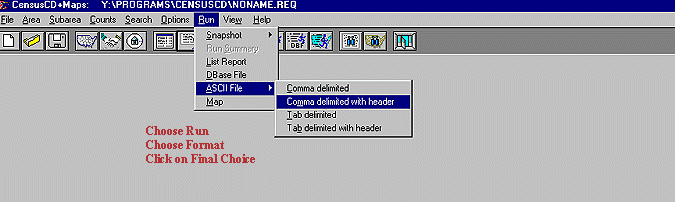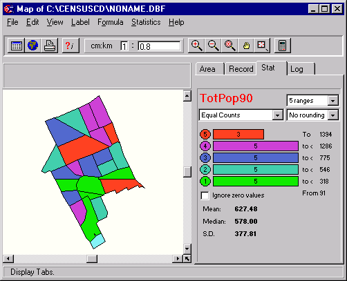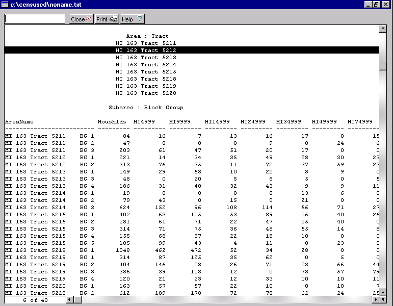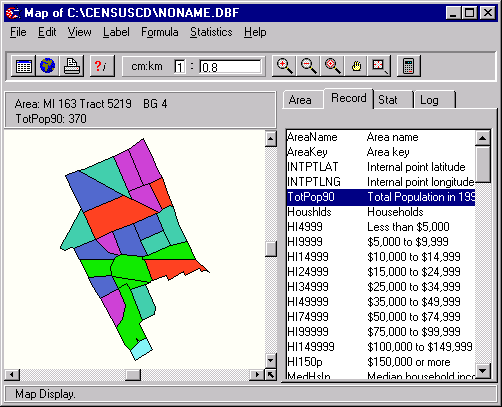 8. You can also create a map. From the top menu, click on RUN/MAP. You will receive a map of all of the block groups in the chosen tracts. Click on the righthand box to change the variable. Run the mouse over the map to get an identification of the block group and tract number as well as the actual data for that area.