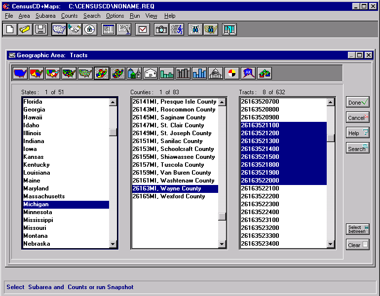 3. In the resulting box, click on Michigan, then Wayne County. You can choose multiple tract numbers (26163/521100-26163/522000) in one of two ways. Either click on them individually OR click on the first (5211) and last (5220), then the Select Between button. Do NOT click on DONE.