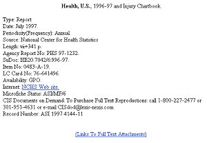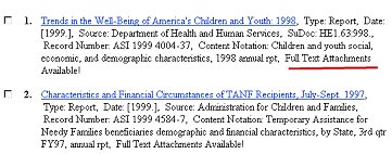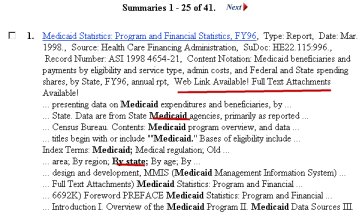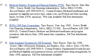 The Default Search Results are listed as the most current first. They provide identifying information, hot links to the abstract, and note whether there is a web link to the entire publication or the statistical portions of the publication. Some also provide links to web sites of the agency responsible for the publication.Search Result Options include Sort by Relevancy and Expanded List, which shows keyword.