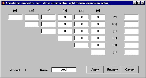 You need to provide the stress-strain matrix at the left and thermal expansion matrix at the right. Please click Cancel to cancel the input of