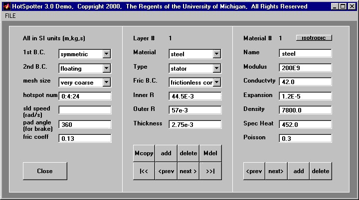 The boundary conditions, etc. are specified in the left column. The geometry parameters are in the middle, and the material properties are in the right column. The current layer shown is the first layer.