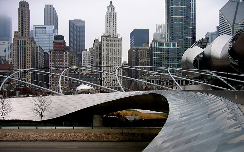 millenium park and the city as seen from the bp bridge. both the bridge and pavillion are frank gehry creations. the sears tower building is on the far left, in the coulds.