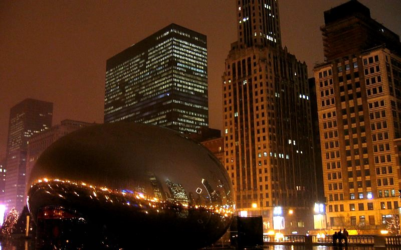 our reflection in the "cloud gate", an ice rink, buildings, and us.