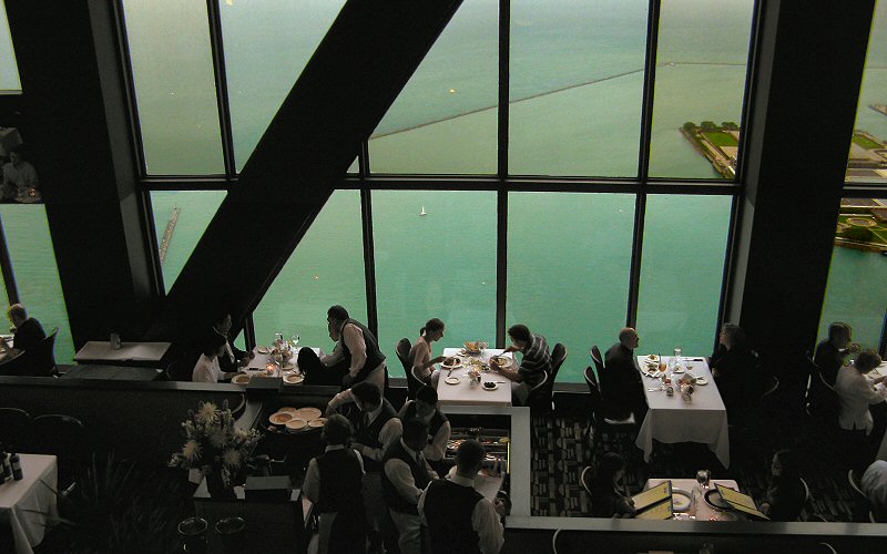 Dinner at 1000 feet (95th floor of the John Hancock building). Through the window is Lake Michigan, the small pointy white thing near center is a sailboat. We just had drinks.
