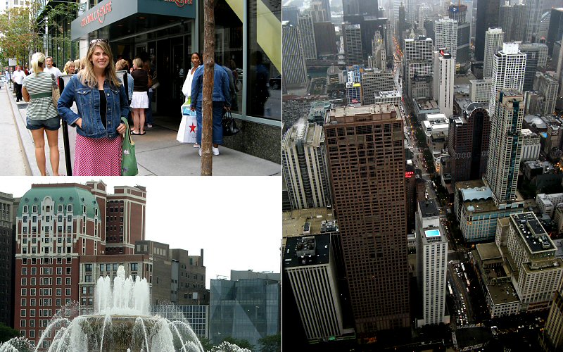 Top: Megan outside the Grand Lux Cafe. Bottom: Buckingham fountain. Right: Michigan Ave from above.