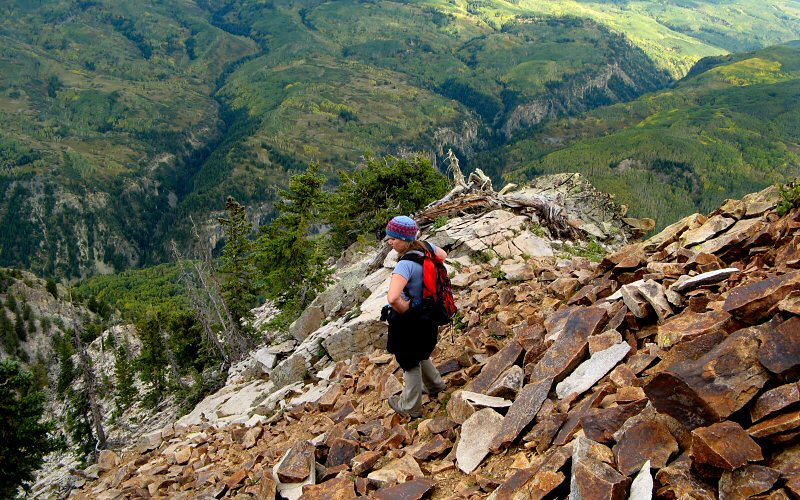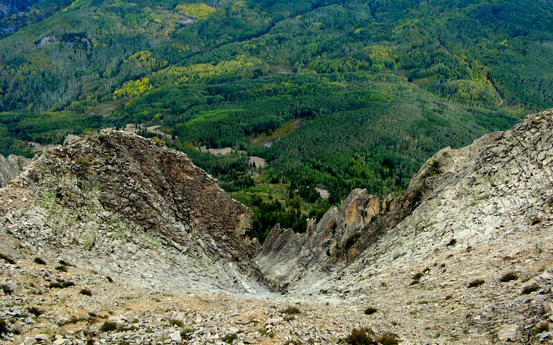 Looking back at the steep couloir we climbed. This couloir is the only spot on the south side of the mountain that isn't a cliff. The east side is surrounded by Dark Canyon so the only other way up the mountain that doesn't require some serious rock climbing is to start at the northwest side near Erickson Springs (I have heard that this is a more gradual route).