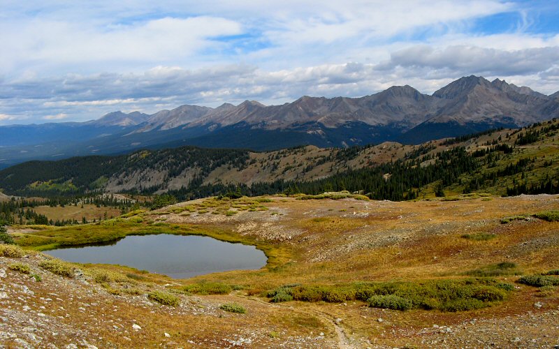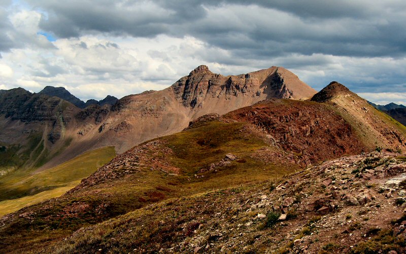 The hike up the valley to Frigid Air Pass is not real scenic in the fall because the wildflowers have long since died and there are no aspen trees, but the view from the pass can't dissappoint. You overlook Fravert Basin and the less-photographed west side of the Maroon Bells, one of Colorado's tallest and most difficult peaks to climb.
