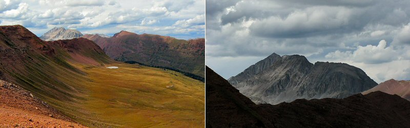 The view to the north, over Fravert Basin, and a closer look at Snowmass Mountain from Frigid Air Pass.