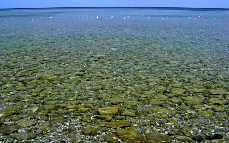 Left: Megan hiking along the northen bluffs. Right: Rocks submerged in the clear waters of Lake Michigan.