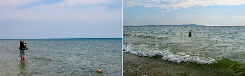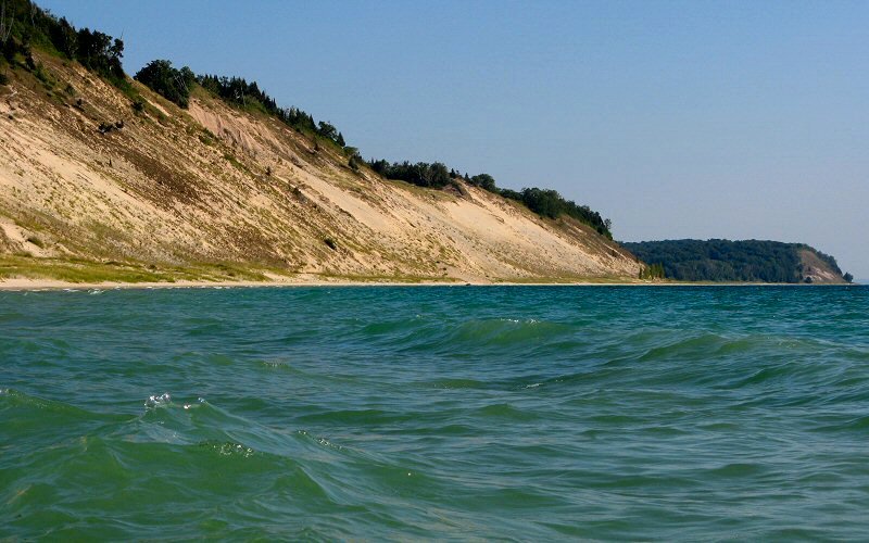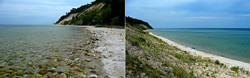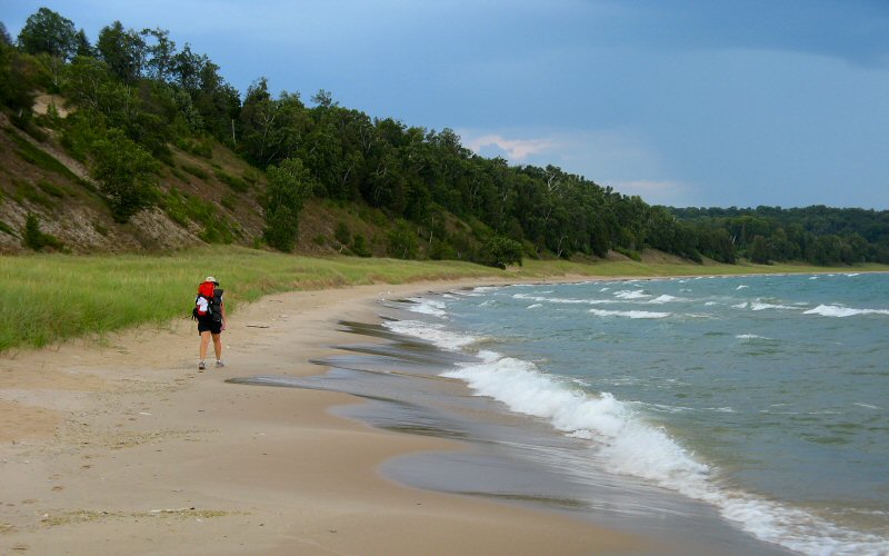 As we rounded the northwest corner of the island we ran into the only people we would come into contact with outside the village area. They were camping in some trees near the beach and filtering water from Lake Michigan. Not far after this, the bluffs got much bigger, the beaches got sandier, South Manitou Island became visible to the southwest, and there were constant 1-2 foot waves. At the south end of the bluffs there was a use trail going straight up the slope from the beach and soon after starting the 300 foot climb, I realized that we would not be climbing any bluffs to camp due to the amount of effort it would take to get to the top (even without my pack). I wandered around above the bluffs for a little bit, trying to get a view east from the island's high point, but there was a line of trees blocking the view. Megan was down below taking a swim and soon I headed down the bluffs to join her. Prior to this experience I had kind of laughed at the NPS warning that hiking on the bluffs "can be dangerous" but these bluffs were very steep and prone to erosion. There was one spot where a huge section had caved in and slid down to the beach. Anyway, I had no desire to climb any more bluffs for the rest of our time there.