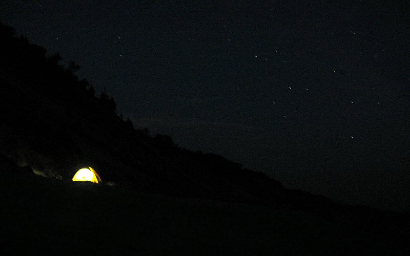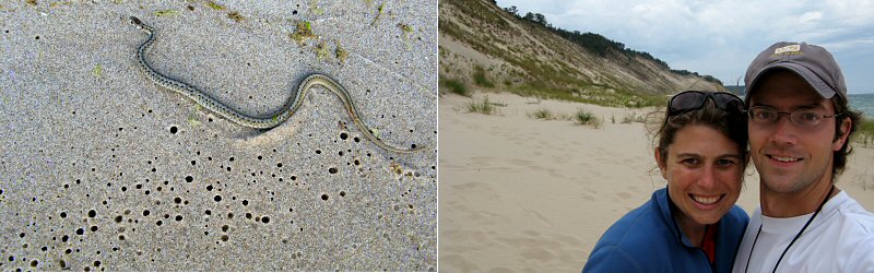 So we setup our tent, swam a bit more, filtered some water (Lake Michigan is flavorless btw) and then sat on the beach to watch the sunset. A storm was coming in so the clouds were interesting to watch. Also occurring on this night was the Perseid meteor shower. The ranger said it had given them a great show the night before and although it was a bit more cloudy now, the Milky Way, Mars, and many many stars were still visible. We saw a few meteors but they were just brief flashes like typical "shooting stars". We slept with the rain fly off the tent so we could look at the stars as we fell asleep. It took forever for me to fall asleep and when I did, Megan woke me up saying she felt sprinkles. There was a lightning storm in the distance so I got up and put the fly on the tent and soon the rain was coming down hard. It was kind of freaky to be in a little tent with lightning flashing all around as the wind and rain pattered away. Luckily the wind never got too bad because we were in a vulnerable spot with no place to flee to. According to the ranger, this was the first rain they had gotten in 2 months.