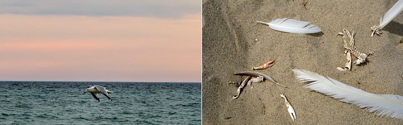 Left: A gull hunting along the shore. Right: Remnants of a meal.