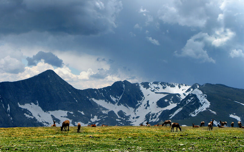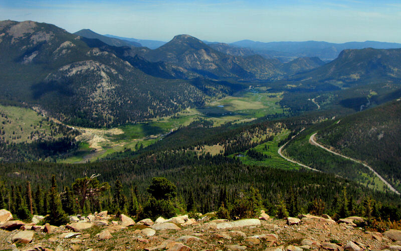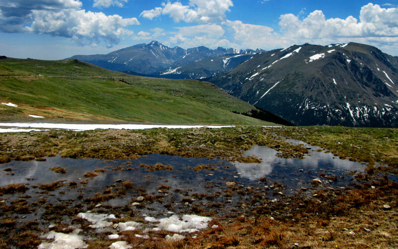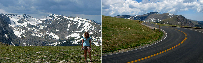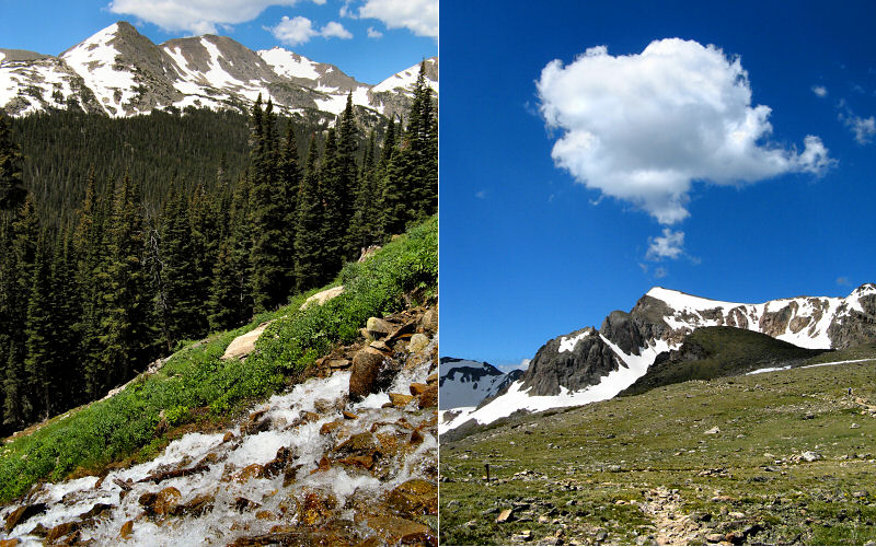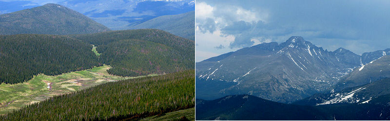 Left: A valley on the west side of Trail Ridge Road. Right: Longs Peak.