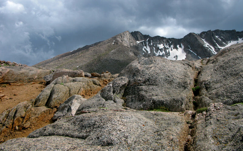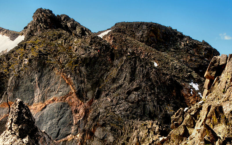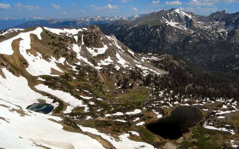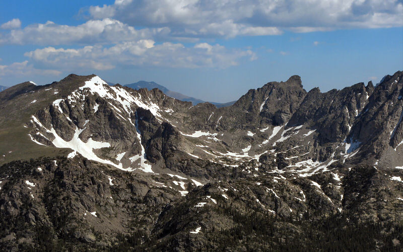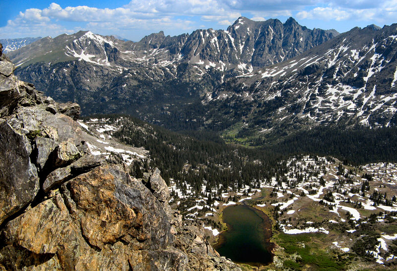 The jagged peaks of Apache and Navajo towering above Caribou Lake, as seen from near Arapahoe Pass.