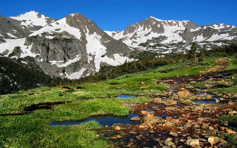 Mount Jasper and Mount Neva as seen from a water saturated meadow just before the trail heads above timberline.