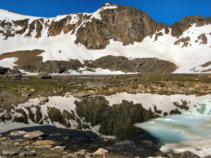 Mount Neva reflecting in a half frozen tarn near Lake Dorothy.