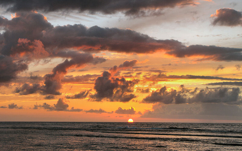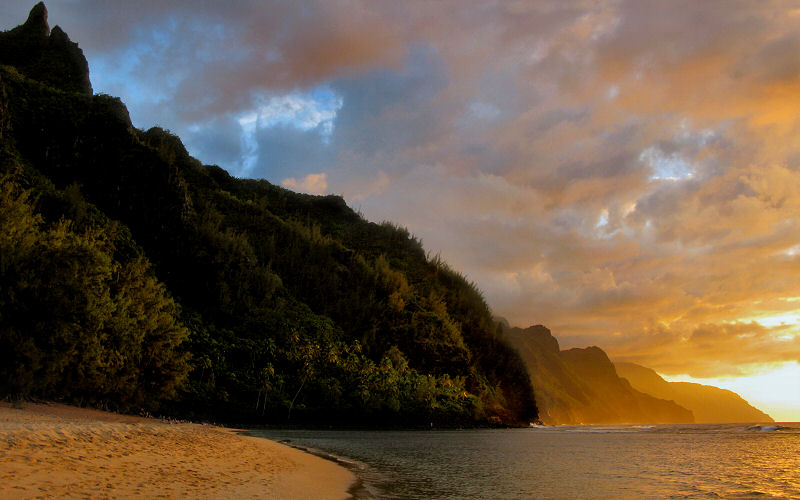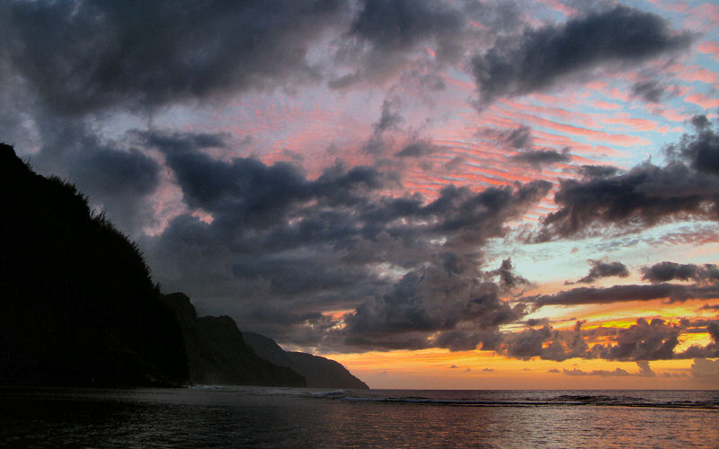 Sunset along the Na Pali cliffs as seen from Ke'e Beach.