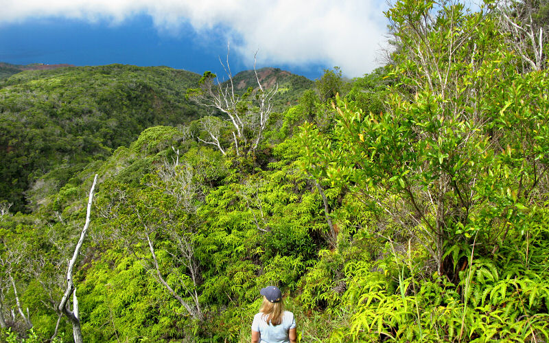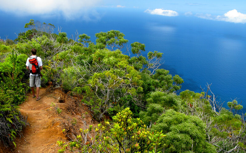 Hiking the rugged Honopu Ridge Trail above the Na Pali Cliffs in Kokee State Park.