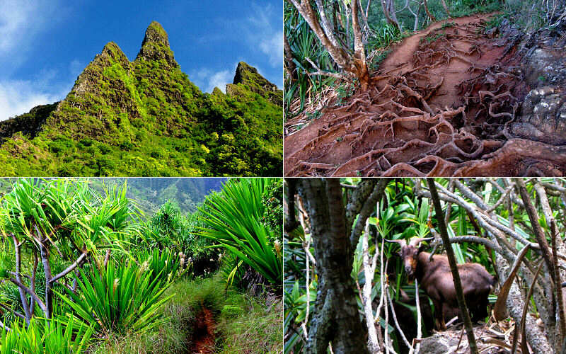 A couple of the many jagged peaks of the Na Pali coast, some shots of the trail, and a goat.