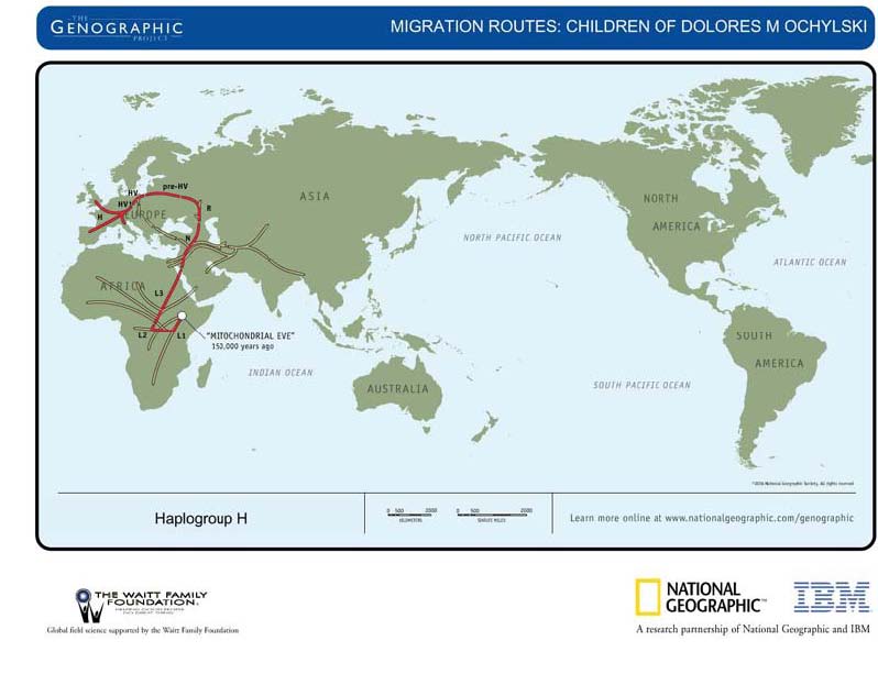![]() ![]() Haplogroup HYour Branch on the Human Family Tree Your DNA results identify you as belonging to a specific branch of the human family tree called haplogroup H. Haplogroup H contains the following subgroups: H, H*, H1, H1*, H10, H11, H11a, H12, H13, H14, H15, H1a, H1b, H1f, H2, H2*, H2a, H2a1, H2b, H3, H4, H4a, H5, H5*, H5a, H5a1, H6a, H6a1, H6c, H7, H8, H9. The map above shows the direction that your maternal ancestors took as they set out from their original homeland in East Africa. While humans did travel many different paths during a journey that took tens of thousands of years, the lines above represent the dominant trends in this migration. Over time, the descendants of your ancestors spread across Eurasia and today make up the most frequent western European haplogroup. But before we can take you back in time and tell their stories, we must first understand how modern science makes this analysis possible. How DNA Can Help The string of 569 letters shown above is your mitochondrial sequence, with the letters A, C, T, and G representing the four nucleotidesthe chemical building blocks of lifethat make up your DNA. The numbers at the top of the page refer to the positions in your sequence where informative mutations have occurred in your ancestors, and tell us a great deal about the history of your genetic lineage. Here's how it works. Every once in a while a mutationa random, natural (and usually harmless) changeoccurs in the sequence of your mitochondrial DNA. Think of it as a spelling mistake: one of the "letters" in your sequence may change from a C to a T, or from an A to a G. After one of these mutations occurs in a particular woman, she then passes it on to her daughters, and her daughters' daughters, and so on. (Mothers also pass on their mitochondrial DNA to their sons, but the sons in turn do not pass it on.) ![]() Geneticists use these markers from people all over the world to construct one giant mitochondrial family tree. As you can imagine, the tree is very complex, but scientists can now determine both the age and geographic spread of each branch to reconstruct the prehistoric movements of our ancestors. By looking at the mutations that you carry, we can trace your lineage, ancestor by ancestor, to reveal the path they traveled as they moved out of Africa. Our story begins with your earliest ancestor. Who was she, where did she live, and what is her story? Your Ancestral Journey: What We Know Now We will now take you back through the stories of your distant ancestors and show how the movements of their descendants gave rise to your mitochondrial lineage. Each segment on the map above represents the migratory path of successive groups that eventually coalesced to form your branch of the tree. We start with your oldest ancestor, "Eve," and walk forward to more recent times, showing at each step the line of your ancestors who lived up to that point. Mitochondrial Eve: The Mother of Us All Ancestral Line: "Mitochondrial Eve" Our story begins in Africa sometime between 150,000 and 170,000 years ago, with a woman whom anthropologists have nicknamed "Mitochondrial Eve." She was awarded this mythic epithet in 1987 when population geneticists discovered that all people alive on the planet today can trace their maternal lineage back to her. But Mitochondrial Eve was not the first female human. Homo sapiens evolved in Africa around 200,000 years ago, and the first hominidscharacterized by their unique bipedal statureappeared nearly two million years before that. Though Homo sapiens have been around for about 200,000 years, about 150,000 to 170,000 years ago, a woman was born from whom we are all descended. This happened 30,000 years after Homo sapiens evolved in Africa. Eventually, for any number of reasons, all of the other lineages of people went extinct, and "Mitochondrial Eve" as we call her, was the only female who had descendants that are now living in the present day. We can all be traced ![]() we call her, was the only female who had descendants that are now living in the present day. We can all be traced back to that one woman, who lived about 170,000 years ago. Which begs the question, "So why Eve?" Simply put, Eve was a survivor. A maternal line can become extinct for a number of reasons. A woman may not have children, or she may bear only sons (who do not pass her mtDNA to the next generation). She may fall victim to a catastrophic event such as a volcanic eruption, flood, or famine, all of which have plagued humans since the dawn of our species. None of these extinction events happened to Eve's line. It may have been simple luck, or it may have been something much more. It was around this same time that modern humans' intellectual capacity underwent what author Jared Diamond coined the Great Leap Forward. Many anthropologists believe that the emergence of language gave us a huge advantage over other early human species. Improved tools and weapons, the ability to plan ahead and cooperate with one another, and an increased capacity to exploit resources in ways we hadn't been able to earlier, all allowed modern humans to rapidly migrate to new territories, exploit new resources, and outcompete and replace other hominids, such as the Neandertals. It is difficult to pinpoint the chain of events that led to Eve's unique success, but we can say with certainty that all of us trace our maternal lineage back to this one woman. The L Haplogroups: The Deepest Branches Ancestral line: "Eve" > L1/L0 Mitochondrial Eve represents the root of the human family tree. Her descendents, moving around within Africa, eventually split into two distinct groups, characterized by a different set of mutations their members carry. These groups are referred to as L0 and L1, and these individuals have the most divergent genetic sequences of anybody alive today, meaning they represent the deepest branches of the mitochondrial tree. Importantly, current genetic data indicates that indigenous 
