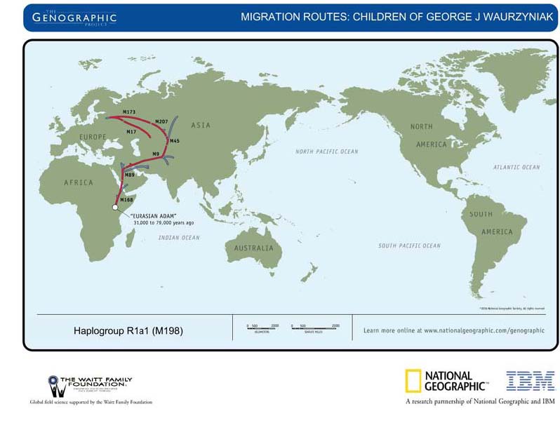 ![]() ![]() Haplogroup R1a1 (M198)Your Y-chromosome results identify you as a member of haplogroup R1a1. The genetic markers that define your ancestral history reach back roughly 60,000 years to the first common marker of all non-African men, M168, and follow your lineage to present day, ending with M17, the defining marker of haplogroup R1a1. If you look at the map highlighting your ancestors' route, you will see that members of haplogroup R1a1 carry the following Y-chromosome markers: M168 > P143 > M89 > L15 > M9 > M45 > M207 > M173 > SRY10831.2 > M17 (Less is known about some markers than others. What is known about your journey is reflected below.) Today a large concentration—around 40 percent—of the men living in the Czech Republic across the steppes to Siberia, and south throughout Central Asia are members of haplogroup R1a1. In India, around 35 percent of the men in Hindi-speaking populations belong to this group. The M17 marker is found in only five to ten percent of Middle Eastern men. The marker is also found in relatively high frequency—around 35 percent—among men living on the eastern side of present-day Iran. What's a haplogroup, and why do geneticists concentrate on the Y chromosome in their search for markers? For that matter, what's a marker? Each of us carries DNA that is a combination of genes passed from both our mother and father, giving us traits that range from eye color and height to athleticism and disease susceptibility. One exception is the Y chromosome, which is passed directly from father to son, unchanged, from generation to generation. Unchanged, that is unless a mutation—a random, naturally occurring, usually harmless change—occurs. The mutation, known as a marker, acts as a beacon; it can be mapped through generations because it will be passed down from the man in whom it occurred to his sons, their sons, and every male in his family for thousands of years. In some instances there may be more than one mutational event that defines a particular branch on the tree. This means that any of these markers can be used to determine your particular haplogroup, since every individual who has one of these markers also has the others. When geneticists identify such a marker, they try to figure out when it first occurred, and in which geographic region of the world. Each marker is essentially the beginning of a new lineage on the family tree of the human race. Tracking the lineages provides a picture of how small tribes of modern humans in Africa tens of thousands of years ago diversified and spread to populate the world. ![]() A haplogroup is defined by a series of markers that are shared by other men who carry the same random mutations. The markers trace the path your ancestors took as they moved out of Africa. It's difficult to know how many men worldwide belong to any particular haplogroup, or even how many haplogroups there are, because scientists simply don't have enough data yet. One of the goals of the five-year Genographic Project is to build a large enough database of anthropological genetic data to answer some of these questions. To achieve this, project team members are traveling to all corners of the world to collect more than 100,000 DNA samples from indigenous populations. In addition, we encourage you to contribute your anonymous results to the project database, helping our geneticists reveal more of the answers to our ancient past. Your Ancestral Journey: What We Know Now M168: Your Earliest Ancestor Fast Facts Time of Emergence: Roughly 50,000 years ago Place of Origin: Africa Climate: Temporary retreat of Ice Age; Africa moves from drought to warmer temperatures and moister conditions Estimated Number of Homo sapiens: Approximately 10,000 Tools and Skills: Stone tools; earliest evidence of art and advanced conceptual skills; Skeletal and archaeological evidence suggest that anatomically modern humans evolved in Africa around 200,000 years ago, and began moving out of Africa to colonize the rest of the world around 60,000 years ago. The man who gave rise to the first genetic marker in your lineage probably lived in northeast Africa in the region of the Rift Valley, perhaps in present-day Ethiopia , Kenya, or Tanzania, some 31,000 to 79,000 years ago. Scientists put the most likely date for when he lived at around 50,000 years ago. His descendants became the only lineage to survive outside of Africa, making him the common ancestor of every non-African man living today. But why would man have first ventured out of the familiar African hunting grounds and into unexplored lands? It is likely that a fluctuation in climate may have provided the impetus for your ancestors' exodus out of Africa. ![]() The African ice age was characterized by drought rather than by cold. It was around 50,000 years ago that the ice sheets of northern Europe began to melt, introducing a period of warmer temperatures and moister climate in Africa. Parts of the inhospitable Sahara briefly became habitable. As the drought-ridden desert changed to a savanna, the animals hunted by your ancestors expanded their range and began moving through the newly emerging green corridor of grasslands. Your nomadic ancestors followed the good weather and the animals they hunted, although the exact route they followed remains to be determined. In addition to a favorable change in climate, around this same time there was a great leap forward in modern humans' intellectual capacity. Many scientists believe that the emergence of language gave us a huge advantage over other early human species. Improved tools and weapons, the ability to plan ahead and cooperate with one another, and an increased capacity to exploit resources in ways we hadn't been able to earlier, all allowed modern humans to rapidly migrate to new territories, exploit new resources, and replace other hominids. M89: Moving Through the Middle East Fast Facts Time of Emergence: 45,000 years ago Place: Northern Africa or the M