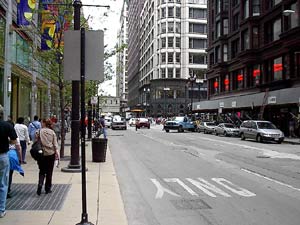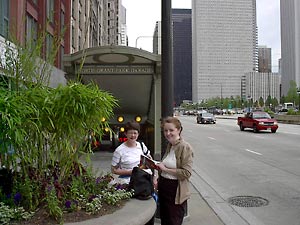 It was a long and grueling ride on the Amtrak train (we were stalled for an hour and a half near picturesque GAry, Indiana) from Ann Arbor to Union Station. After a quick hike to the Metra station two blocks away, Kathy met us in Crystal Lake. We went back to her place for a wonderful surf 'n' turf cookout. The next morning we rode the train back into the city. On our way to the art museum, we stopped to enjoy some of the civic art and historic architecture, including the Carson Pirie Scott building at State and Madison (below) and "The Picasso" (right) in front of the Daley Center. |