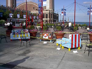 After shuffling through art for a couple of hours, our legs were pretty rubbery, so we took a cab to Navy Pier and had a nice lunch. Revived, we wandered through the shops inside Navy Pier, and the marvelous Stained Glass museum. We encountered more furniture art when we went out on the waterfront. | ![]() |