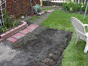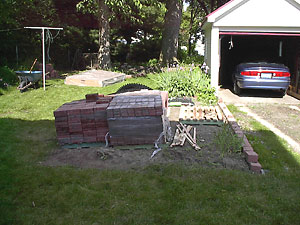 We grew a crop of eleven-hundred-fifty pavers on out front garden this year. You can barely see the step forms in the back, but there are twelve of those too. After the rose-bed wall was finished we started bustin' sod and digging out the top layer of dirt. Pavers don't like to sit on top of organic material and we want to keep the digging to a minimum. |
