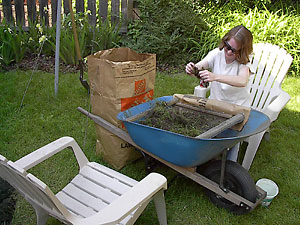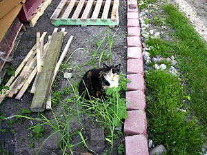 Picking apart clods of sod to get the dirt out of the roots is a leisure time activity we have spent long enjoyable hours pursuing. Now what we want is a firm packed base at a gentle grade away from the house. Well, we got so good at keeping things on the level for the castle blocks, this grade thing will take some getting used to. Oh, and that's Abby taking a short break from her supervisory role to roll in some catnip. |
