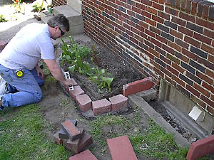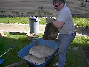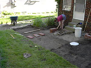Building the Patio In this case we had to get the old concrete slab out first. Luckily, Tom was in town. We asked him if he was hungry. Luckily, he was. We told him if he busted up that slab we would feed him. Really wish we'd gotten a picture of him swinging the sledge hammer! We needed a solid border around the rose bed for the patio to abut. Tom felt the need to learn something, so we all took turns setting the blocks in a ditch Jim had dug. |
