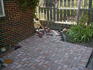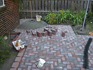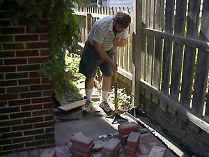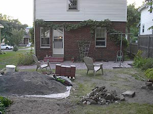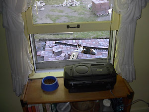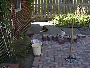 To do a fine job; you have to do the set up first. The kitties have food and we have some music. Some materials and tools also help things go smoother. We skipped a few days since last we work in the back yard. First it was hot and we took that day off. When a thunderstorm rolled through we enjoyed watching the rain flow off the patio in the right direction. |