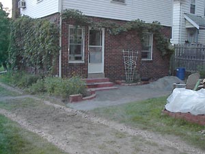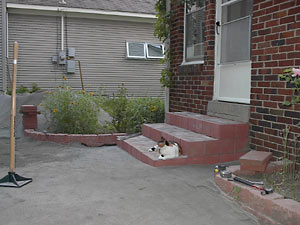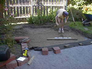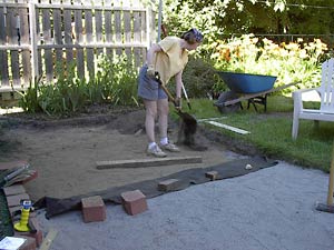 On Sunday we had to figure out where to put all that sand. We continued leveling and grading the patio area, aiming for a slight slope away from the house (it had originally sloped toward the house, because of the big trees in the yard). Chris worked her magic without disturbing the dirt too much. Then Jim tamped the area to ensure a good, compressed base. Then we were able to lay more patio liner, and move the sand. Emma watched our efforts with approval. |