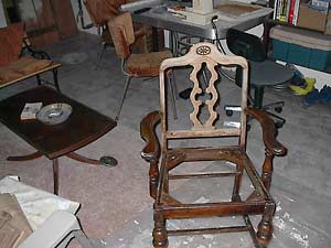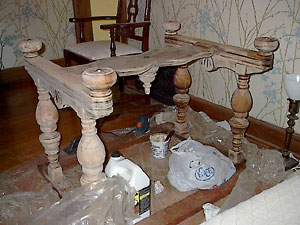 looks like a work shop with strippin' goo, scrappers, sandpaper, and staining