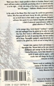 In his younger days, Currie hunted "comboys"--people who had unplugged from the global net in order to evade One True, and who hid in wilderness areas, surviving by raiding the outposts of civilization. Now Currie is called back into service to capture the last comboy still at large, a man who calls himself Lobo. With his high tech equipment, thoroughly plugged into the global net, Currie sets out to bring Lobo in.