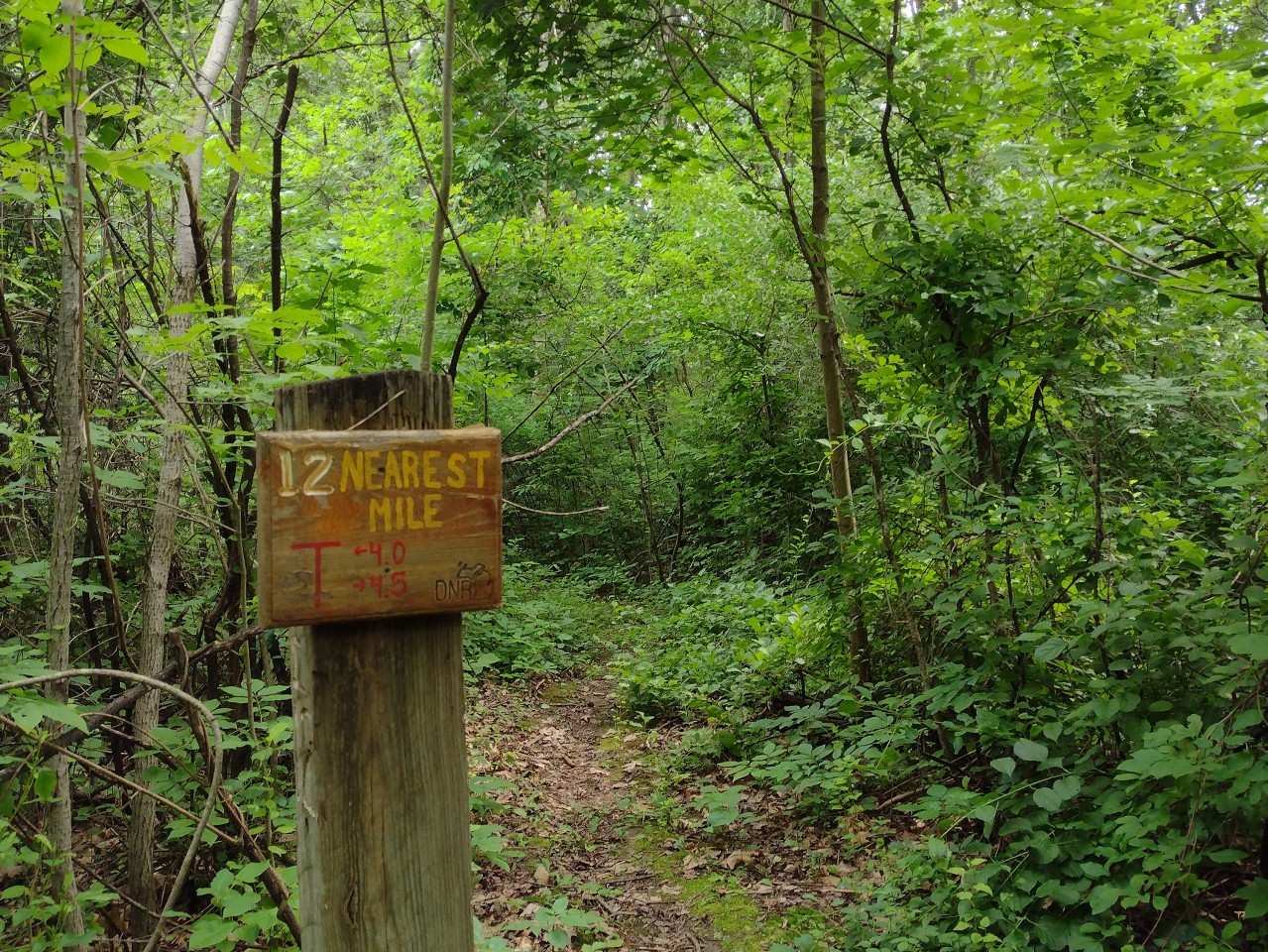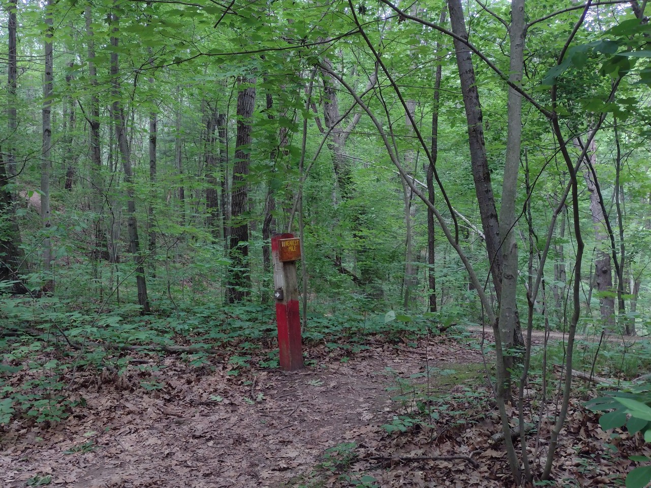 There is a surprising variety of conflicting information about the length of the trail. A Michigan DNR sign posted at Marker 2 indicates that it is 6 miles long, data extracted from the OpenStreetMap suggests that a round trip from the parking lot is 6.9 miles long, a 2022 DNR brochure says 7 miles, and the official trail map indicates 8 miles. The mile markers posted on the trail do appear to be accurate, and if so, it means that 8 miles is very close to the truth.