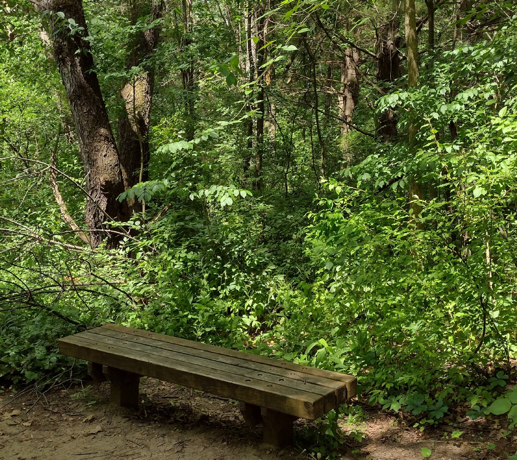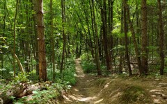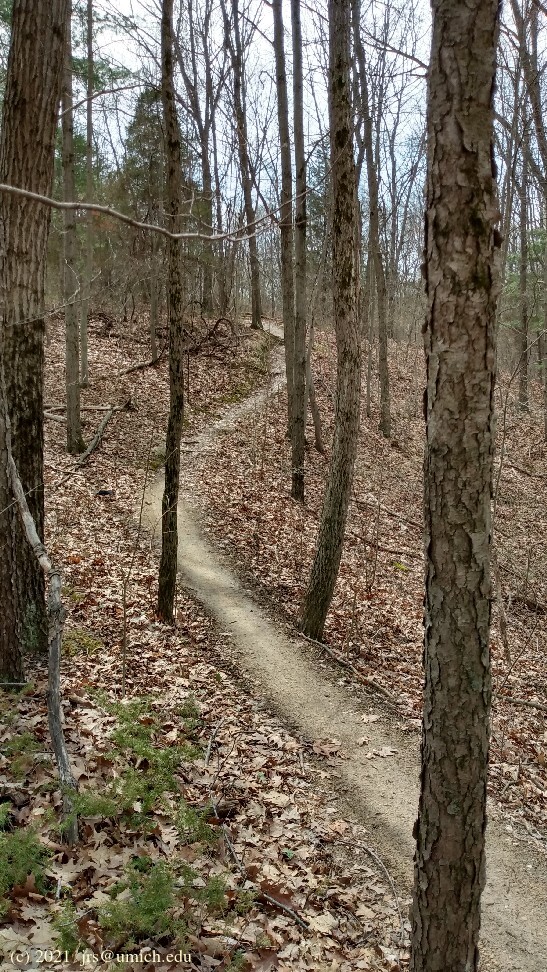 The outbound (clockwise) portion of the trail runs relatively close to unpaved Bishop Lake and Cunningham Lake Roads, so you may be forced to endure road noise from the occasional passing vehicle. However, the inbound portion is much quieter. It runs deeper into the forest, and at times there is further buffering provided by intervening hills and ridges.