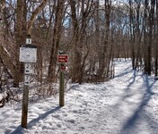 The trailhead displays a map indicating that the Penosha Trail is 6 miles long. This seems to be an exaggeration -- MapPedometer indicates that a round trip (from Marker 1 back to Marker 1) is 4.75 miles, or 4.85 miles if you include the walk out and back to the parking lot. This is more in line with what is posted on the online trail map (5 miles), and is consistent with the mileage markers installed recently on the trail.