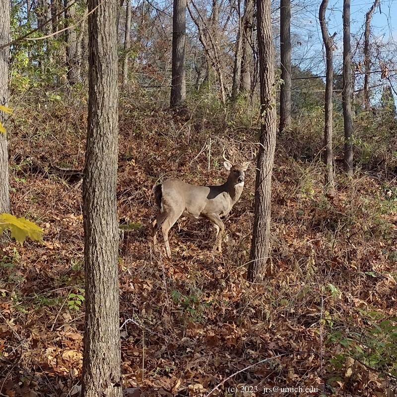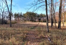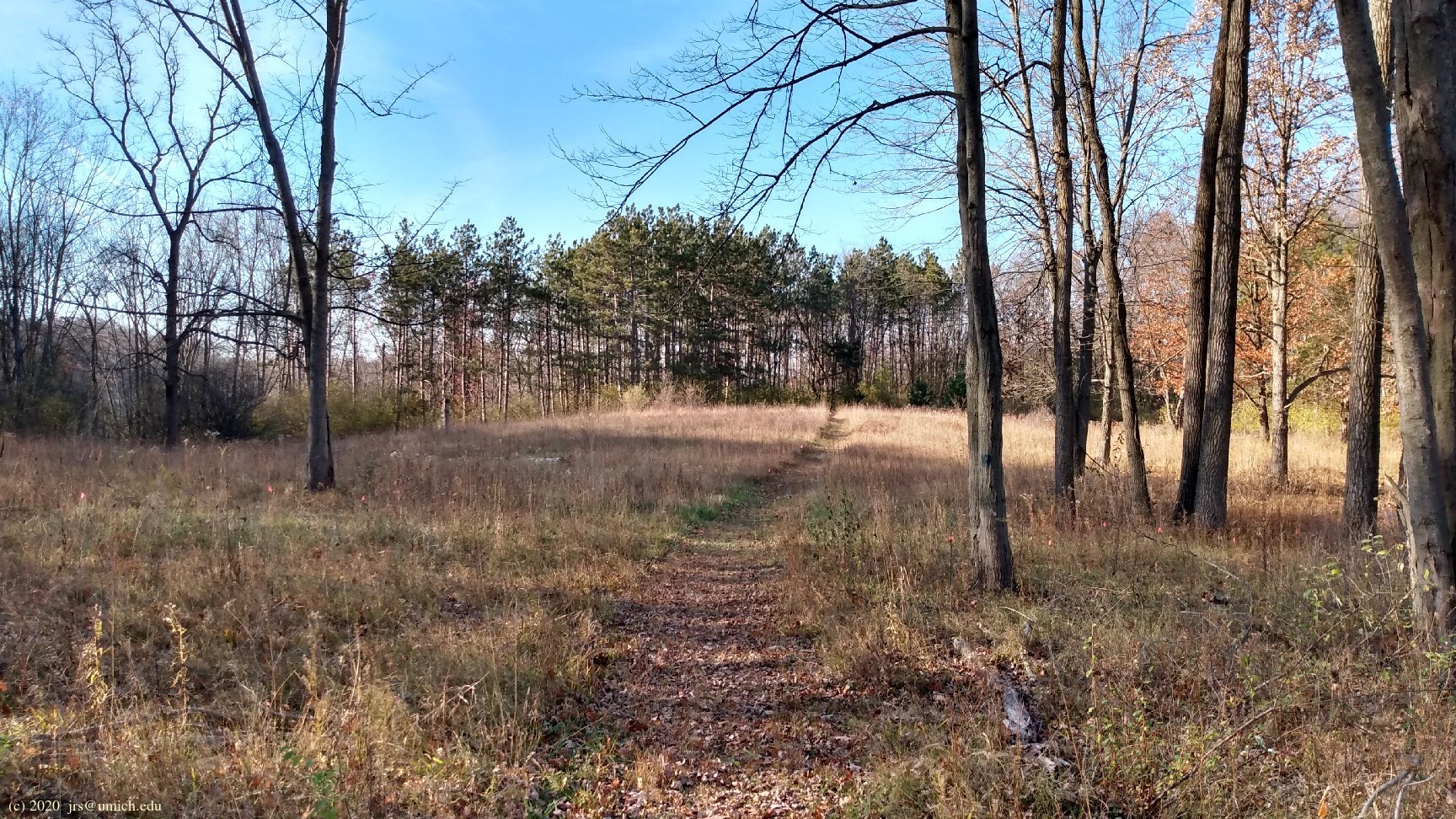 West from the parking area [at the Marshall Nature Area] is an open oak grove (which was the former site of a house). Trails begin at the northwest corner of the oak grove.... Much of the forested area is open with mixed hardwoods such as oak, hickory, maple and beech. Dogwoods and a variety of wildflowers add springtime color to the park. Pockets of planted pine and spruce are found on the south and west side of the park. The main trail will loop through both types of woods and the fields. Small, seasonally wet areas are found along the loop trail, so be prepared. The area directly north of the parking lot is mostly shrub-thicket. A trail from Dixboro Rd. bisects this area and joins the main trail in the eastern most field.
