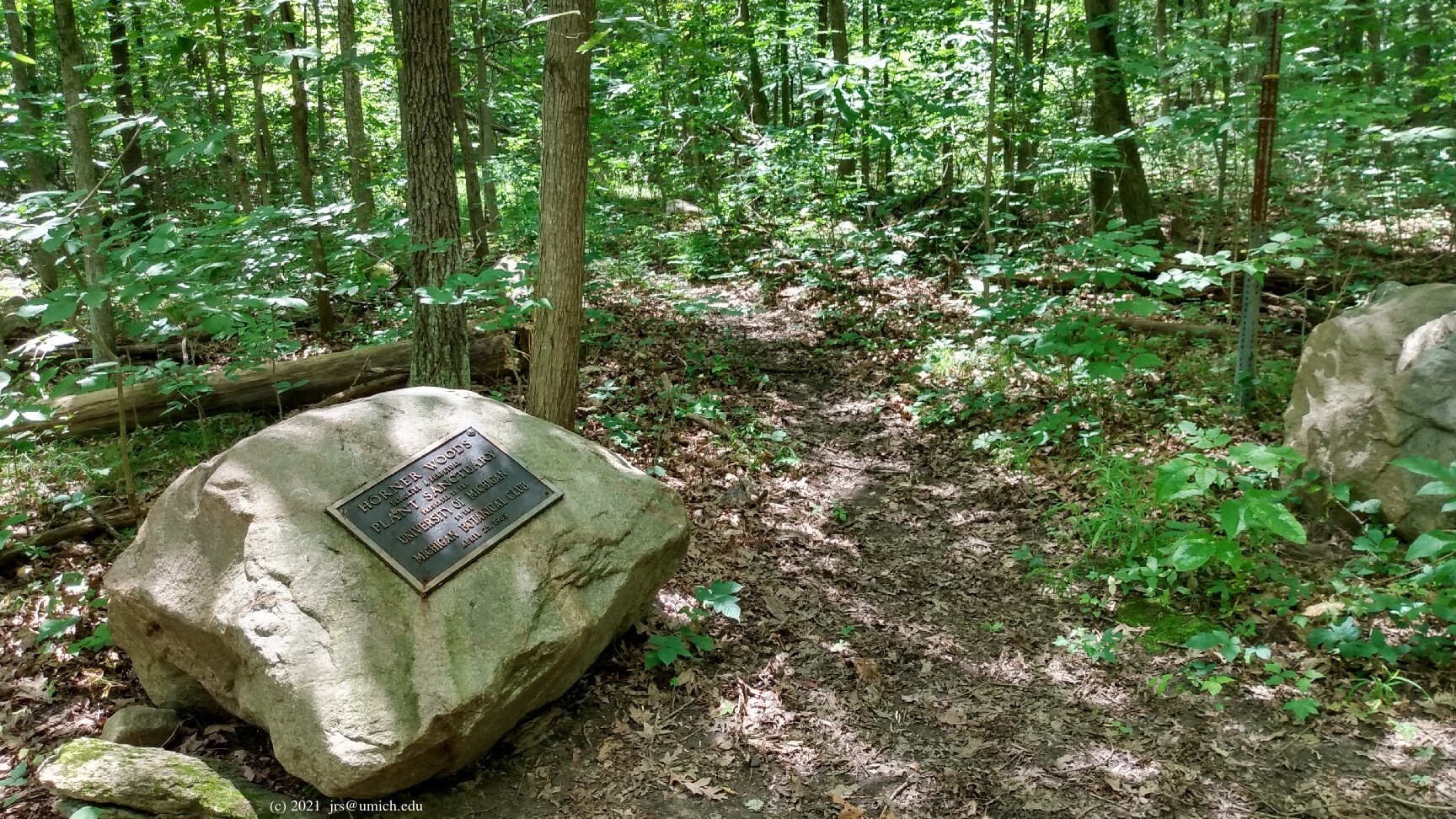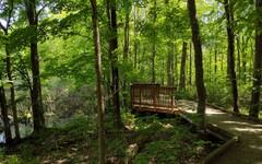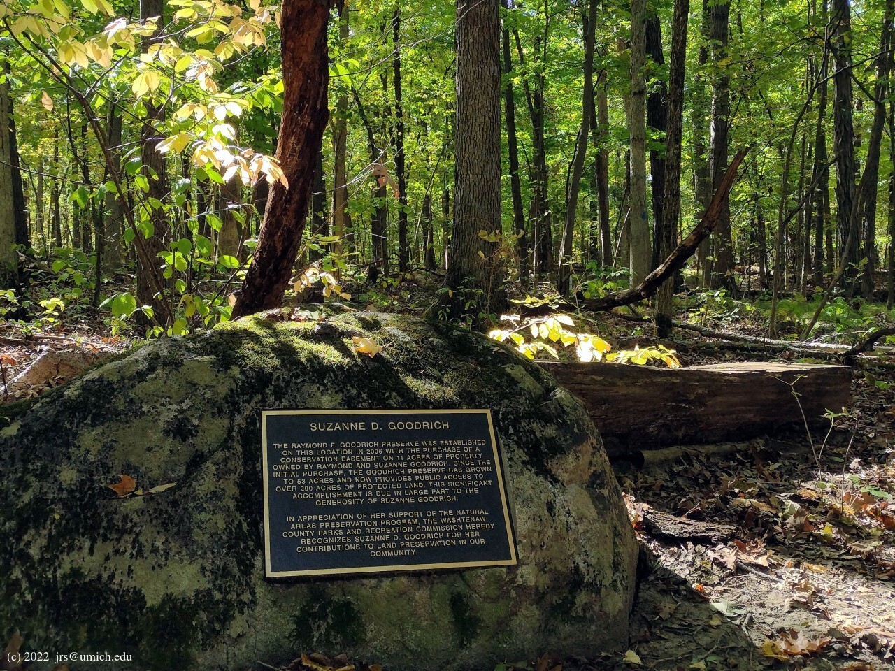 For a good hiking opportunity close to the city of Ann Arbor, the Goodrich Preserve is the perfect spot. The neighboring Horner Woods complex -- used primarily by U of M for research, teaching and fieldwork -- is dominated by old growth forest that grades from hilltop oak-hickory on the eastern Goodrich property to maple-mixed hardwoods covering rich central valleys. Native shrubs, predominantly buttonbush, surround several small wetlands and fill a large swamp which separates much of the woodland from the M-14 freeway. The central portion of this forest, known for its outstanding spring wildflower displays, is preserved by U-M as a plant sanctuary.