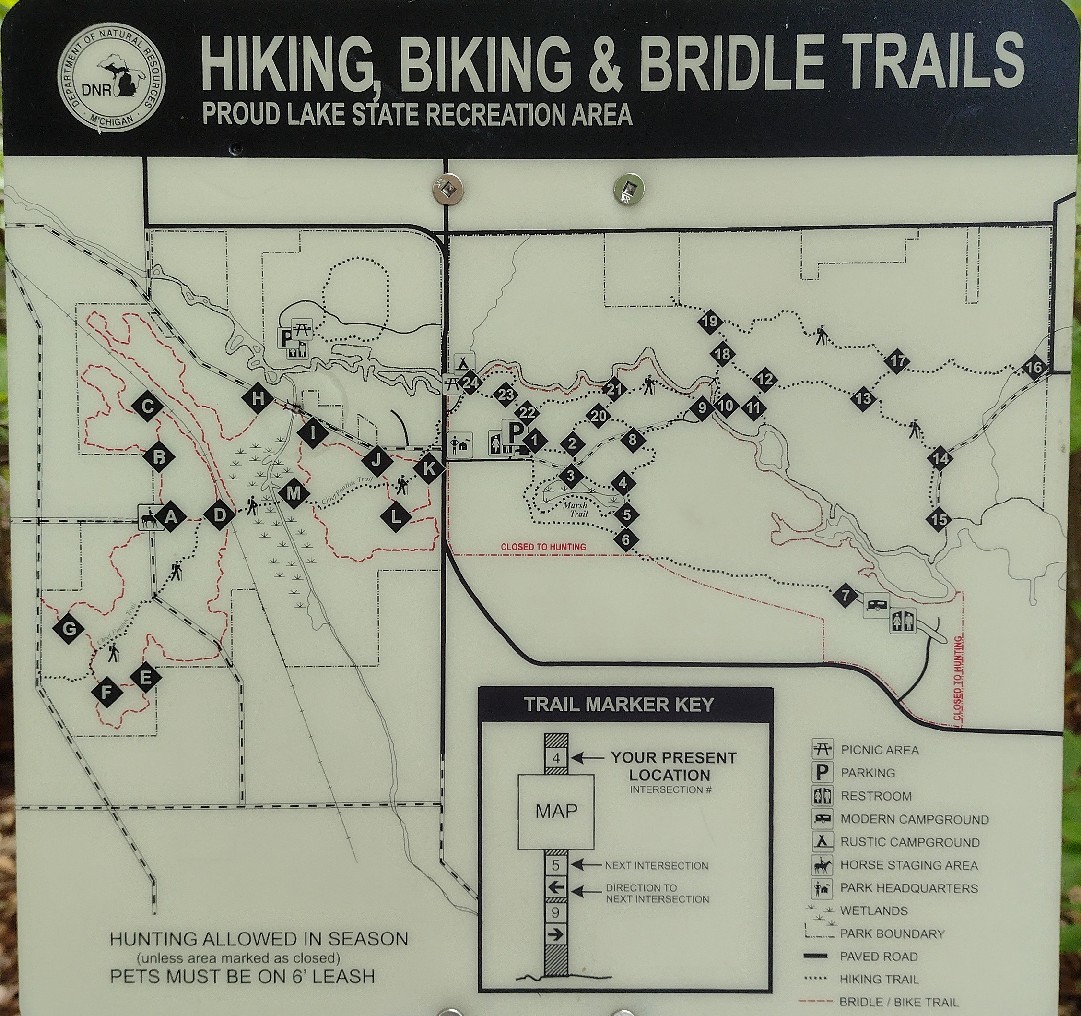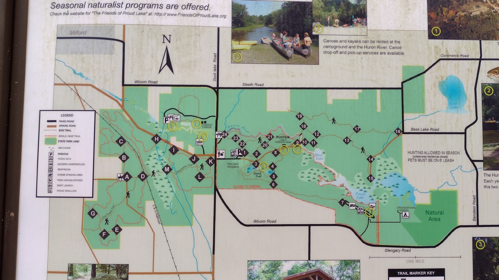 Most of the hiker-only trails are on the east side of Wixom Road. There you will find numerous options, including three loops: the Marsh Trail and the overlapping Red and Blue Trails. West of Wixom there are several multi-use trails for hikers, equestrians and mountain bikers. Cutting across both sides of Wixom is the Chief Pontiac Trail, a point-to-point hiking trail that runs parallel to the Huron River on the east side, through the fishing/picnic area at Marker 24[*] near Wixom Road, followed by a long gentle ascent on the way to Old Plank Road at the western boundary of the park.
