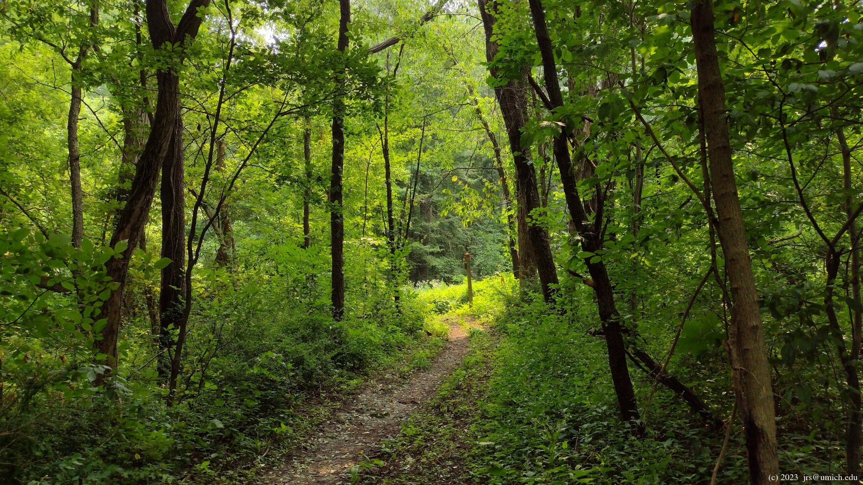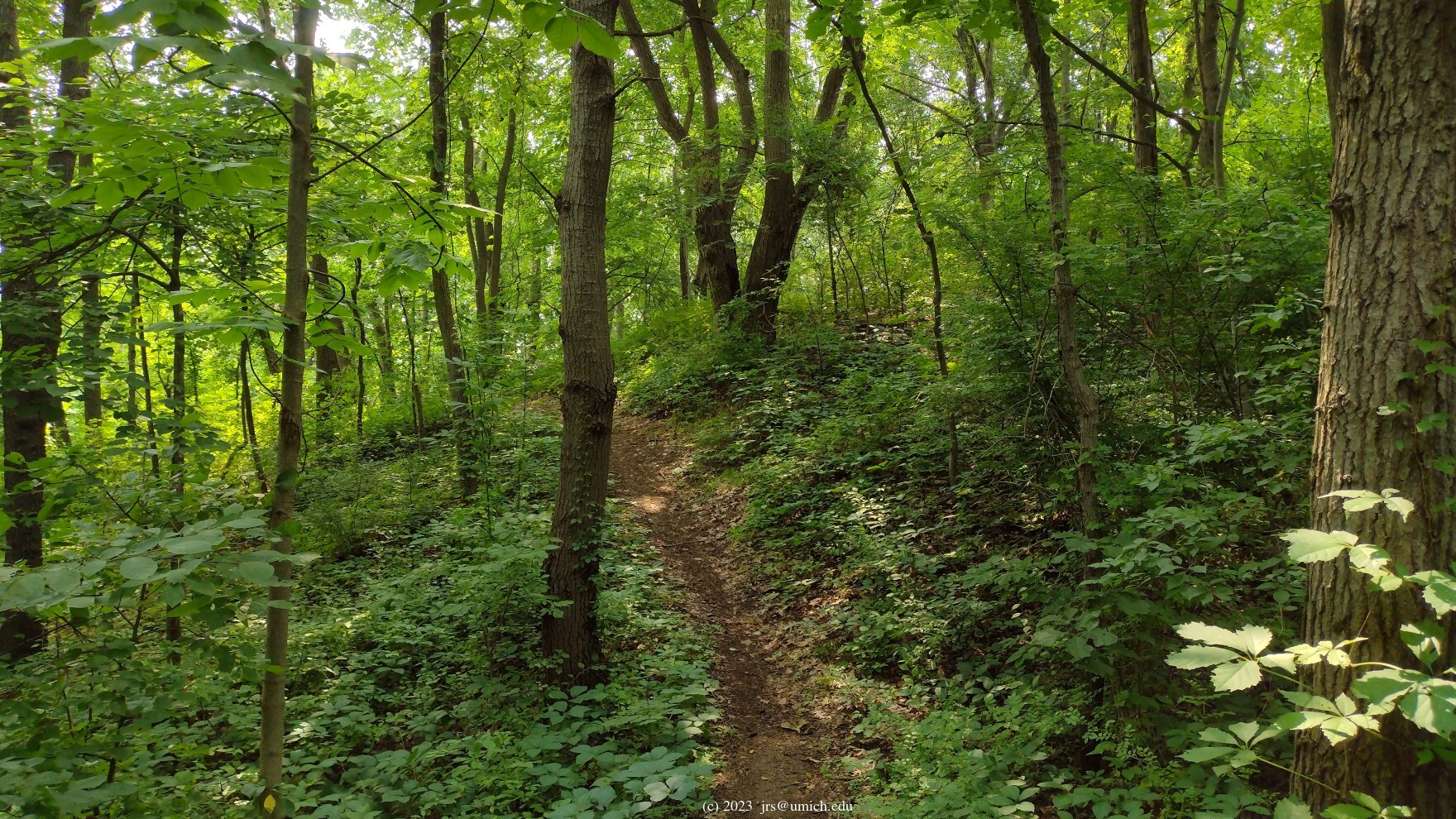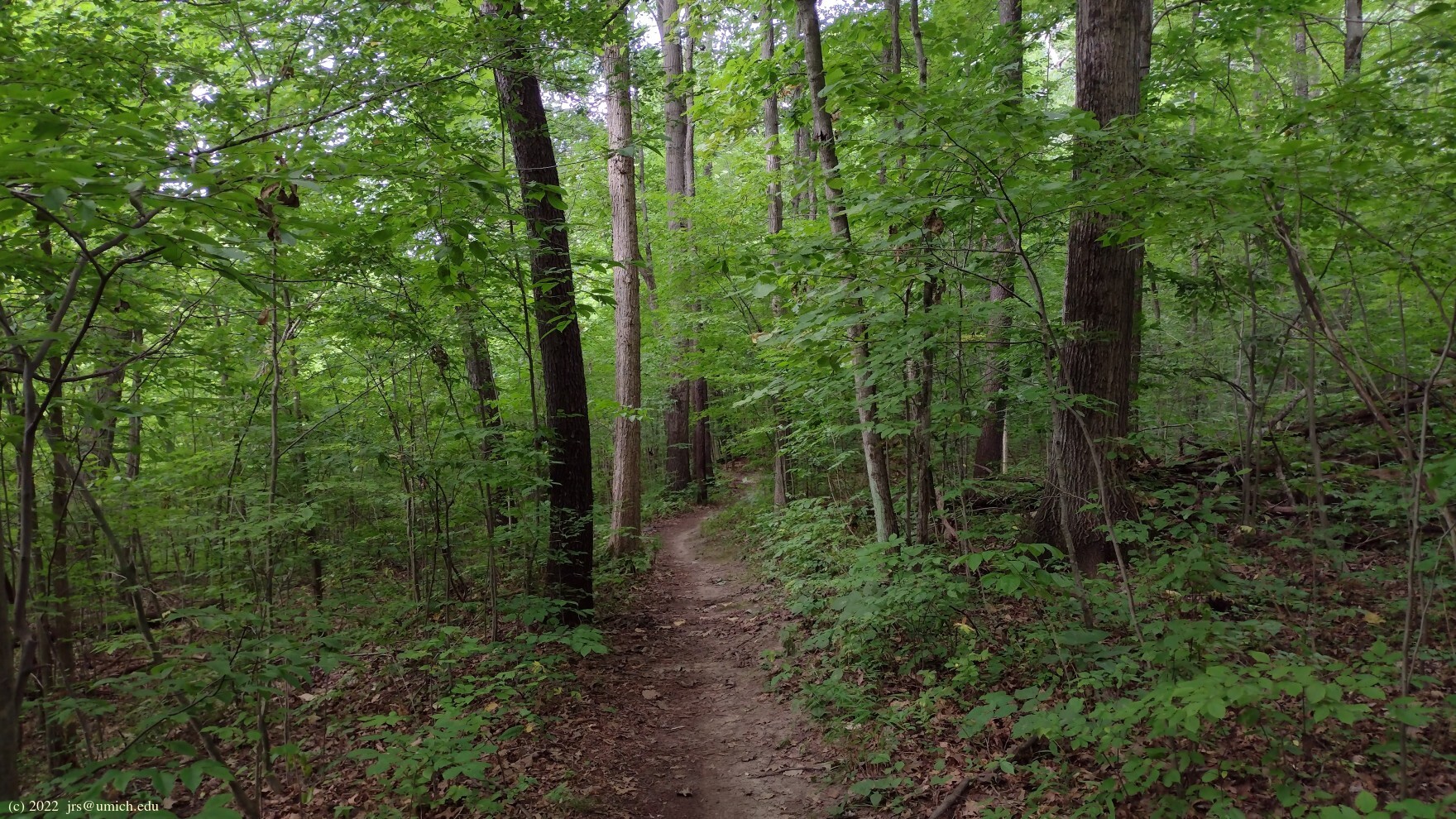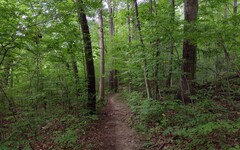 a long gentle climb through dense woods, gaining 200 feet in elevation