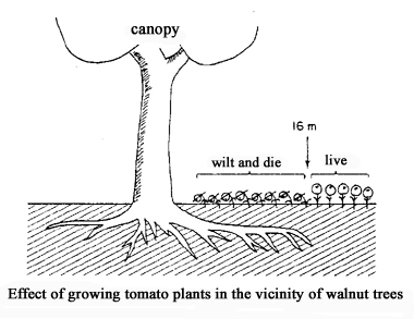 The roots of the walnut release a glycoside which split and oxidized yielding the inhibitor juglone. Juglone inhibits the growth of tomato plants and many other species and may even kill them.