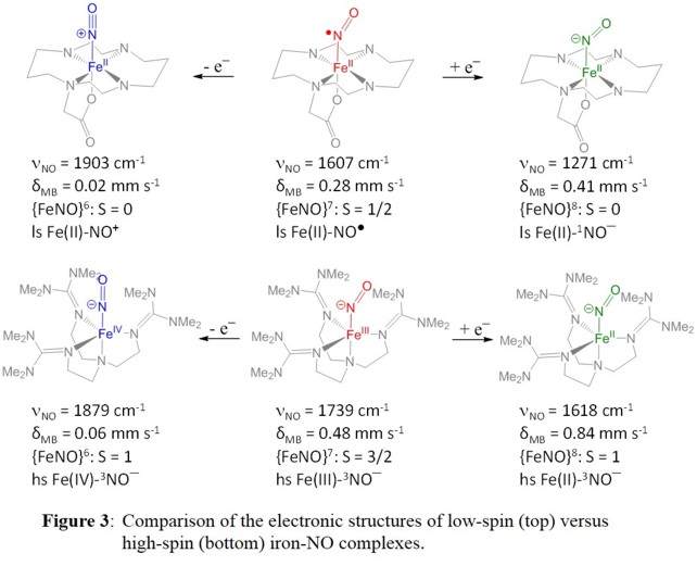 In order to further investigate the properties of non-heme iron-NO complexes in different oxidation states, we then turned to the TMG3tren ligand platform. While there are numerous examples of low-spin heme iron-nitrosyl complexes in different oxidation states, much less is known about high-spin (hs) non-heme iron-nitrosyls in oxidation states other than the formally ferrous NO adducts (or {FeNO}7 in the Enemark-Feltham notation). We were able to prepare the complete series of hs-{Fe-NO}6-8 complexes using the TMG3tren coligand. Redox transformations from the hs-{FeNO}7 complex [Fe(TMG3tren)(NO)]2+ to its {FeNO}6 and {FeNO}8 analogs do not alter the coordination environment of the iron center, allowing for detailed comparisons between these species. We used X-ray crystallography and MCD, NRVS, XANES/EXAFS and Mössbauer spectroscopy, coupled to DFT calculations, to demonstrating that these redox transformations are all metal based, which allows us to access hs-Fe(II)-NO-, Fe(III)-NO- and Fe(IV)-NO- complexes. In contrast, in low-spin iron-nitrosyl complexes, all redox transformations are generally NO-centered. Figure 3 shows a comparison between our hs-{FeNO}6-8 series with the ls-{FeNO}6-8 complexes from Wieghardt's group, based on the cyclam-acetate ligand [4].