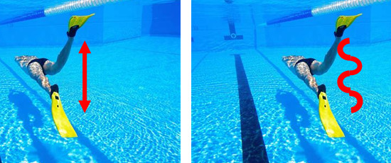 The fins should move in a vertical up and down movement (below, left) giving thrust on both up and downward strokes. If the fins are too stiff for the diver's leg muscles, the fin movement will meander (slip) from side to side during the kick stroke (below right). If this "slippage" movement is observed, the swimming diver should consider a smaller, less rigid fin.