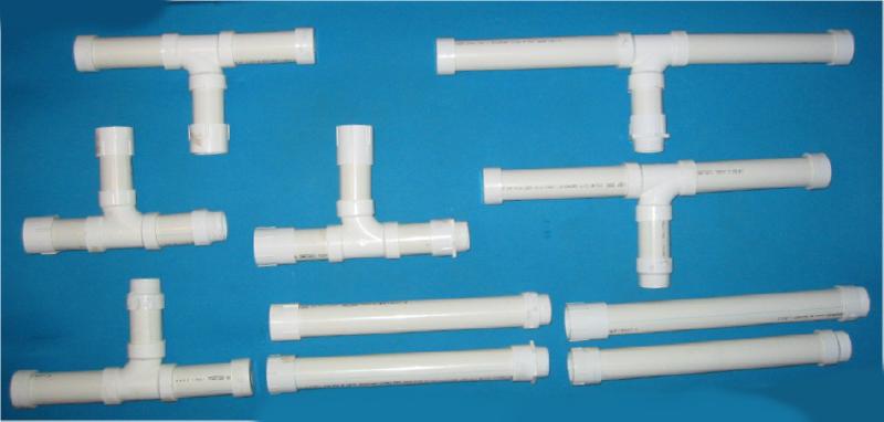 I also prefer the use of male/female joint combinations (instead of press fittings) for strength. Below is a picture of the individual pieces. Each "T" is composed of three short straight pieces glued into a PVC "T" fitting. These short pieces then are fitted with an end-cap or joint, depending on the desired configuration. The size of each piece will depend on the size of the facility where there drying rack is to be used. (i.e.. the shower stall or bath tub dimensions will obviously be the limiting factor).