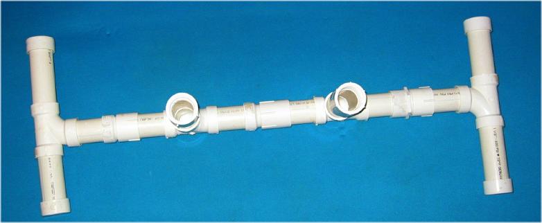 The base is assembled from the 4 "T" assemblies shown at the fat left of the above illustration. The two "T's with capped ends are the end pieces. The two "T' 's with male/female ends are used for the internal support for the vertical shafts. The assembled base is shown below. My base has a total width of 14".and a length of 36".