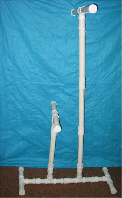 I use two vertical shafts; each ending in a capped "T" piece. I use the shorter one (single 16" straight piece; one end female, the other end male) for the b.c. and the taller one (three 16" pieces) for the wet suit and chaps. The assembled rack is shown in the below left illustration. The rack, in use, is shown in the illustration, below right.